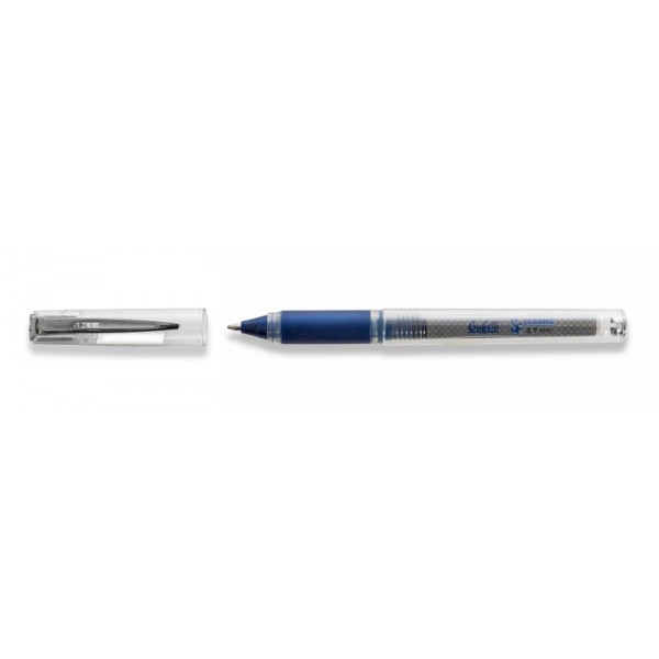 Roller superfluid con fusto trasparente, clip e fondello in metallo cromato. Impugnatura in gomma e puntale nel colore dell'inchiostro. Sfera in ceramica da 0,7 mm.