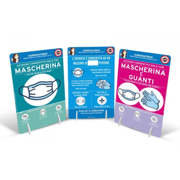 Cartelli da banco realizzati in cartoncino con l'indicazione degli obblighi da rispettare prima di entrare in un locale o direttamente nelle aree interne.