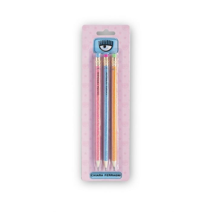 Matite in grafite HB diametro 2 mm., perfettamente cancellabile Matite in tre versioni : olografica + Eyelike rosa + Eyelike azzurro. Finitura rosa Gold con gommina. Blister gift pack per il regalo perfetto.